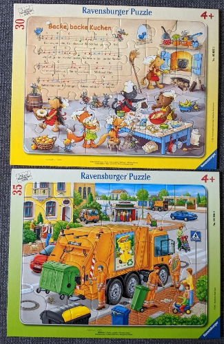 В паззлы играет и со мной, и с папой. Несколько месяцев не хотел никакие паззлы складывать. Потом достал и резко скакнул до вот этих.