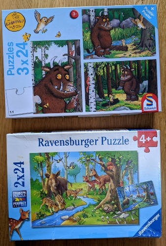 Может постараться и сам сложить. Купила на пробу без рамки, еще не может сам на 24 кусочка, складываем вместе. Но из-за Груффало достает их снова и снова.