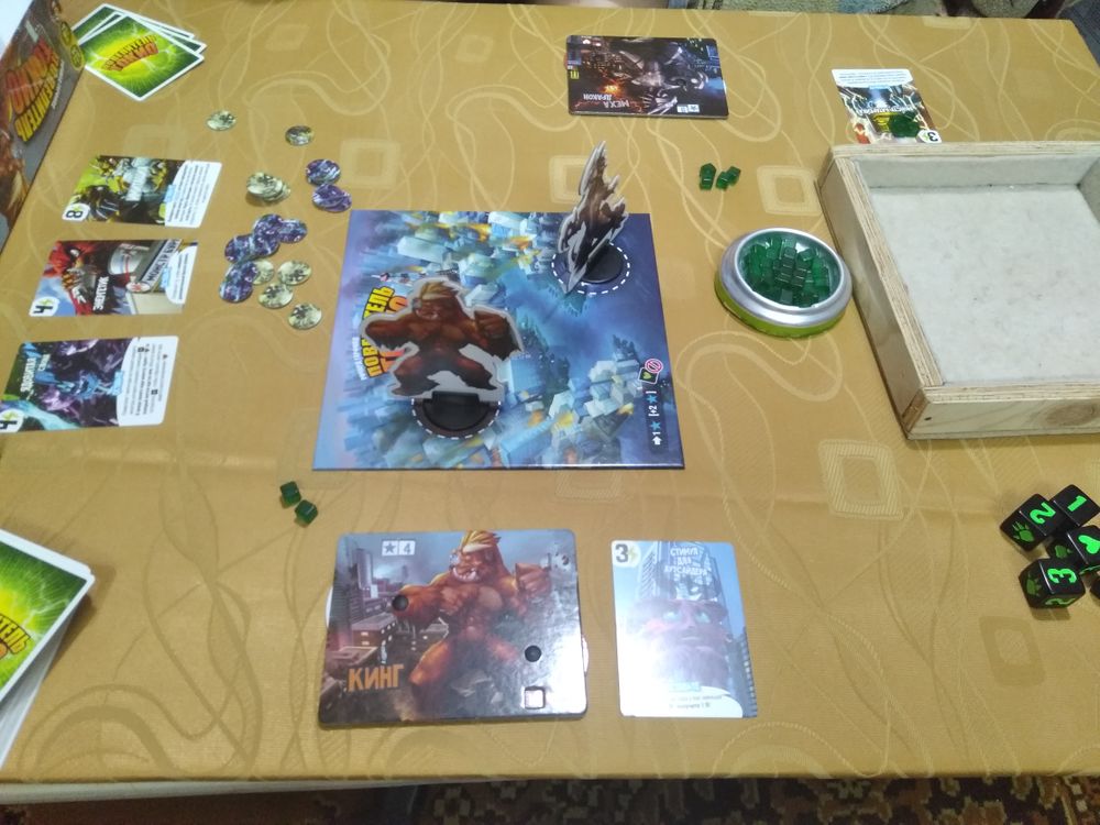 Прикольная игра, конечно. Правила мы вкуривали довольно долго (до сих пор есть вопросы по некоторым картам). Играли втроем. Доча выиграла. Скажем , так - папа с мамой слишком увлеклись сведением счетов и доча, пока ей обьясняли правила, нахапала хороших карт и ….первым ушел папа-конг. Не успел глотнуть здоровья. Уход мамы был делом времени. Бггг. Рано еще дитю в такие игры. Убрал.