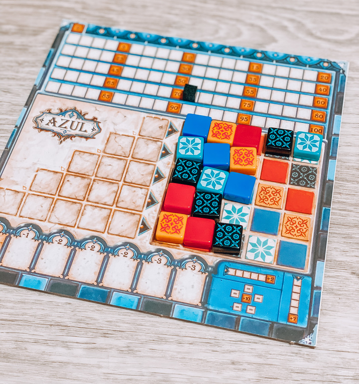 Нам с младшей расходиться не хотелось, достали по ее желанию Азул. Никто к нам присоединиться не захотел и мы сели один на один. Я опять повторила ей лучшую стратегию, что надо выстраивать вертикаль и потом присоединять к ней по бокам плитки. И с самого первого хода она начала действовать именно так. Забрала самые лучшие плитки. Мне пришлось менять все на ходу и собирать тот ряд, на который осталось плиток. В итоге после первого раунда у меня было 0 очков, у неё 6. Как она радовалась 😄.