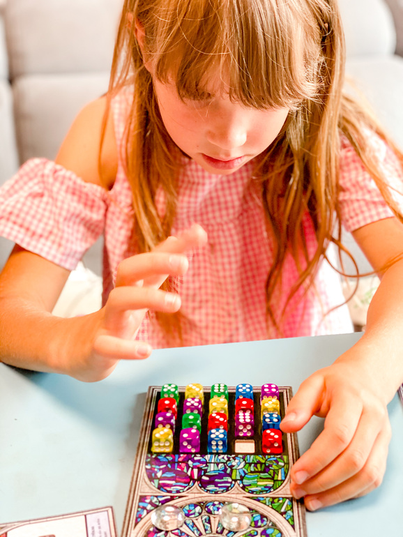 Следующей игрой, в которую попросила поиграть средняя дочь была Саграда. Давно мы ее не доставали. Мы с мужем взяли витражи посложнее, дети попроще. В наших прошлых партиях разница по очкам между взрослыми и детьми была значительной, поэтому сразу оговорили, что дети соревнуются между собой и родители друг с другом.