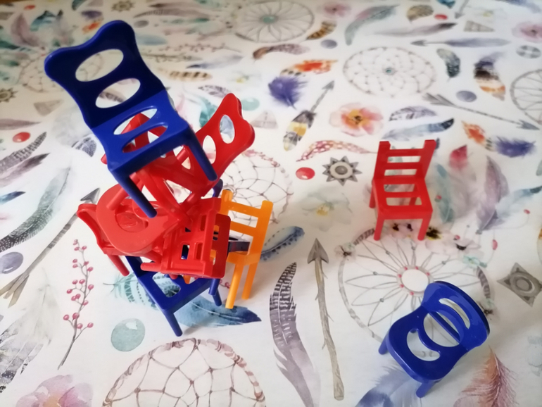 Балансирующие стулья (аналог Мистакос). Довольно простой балансир, как мне кажется, если просто ставить стулья один на один. Они цепляются друг за друга и висят почти в любом положении. Тут тоже есть соблазн пустить эти стульчики на сюжетно-ролевые игры, но к счастью для игры, стульчиков разных у нас и без того хватает.