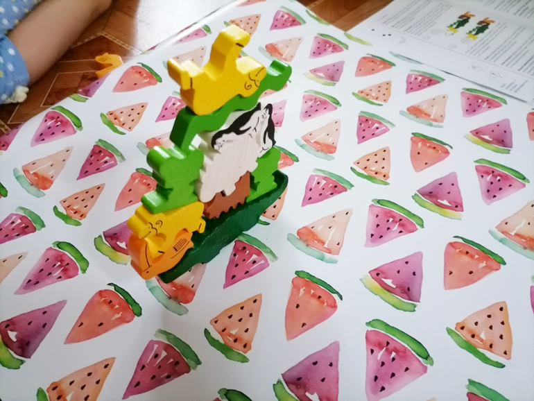 Сплэш - а это балансир как раз-таки из сложных. Микроскопические фигурки, совершенно разная геометрия, определенные условия постановки фигур... Здесь Леденец мне не конкурент, даже при всех моих попытках немного поддаваться. Пусть подрастёт, а мы пока с мужем поиграем на досуге. Игра очень приятная, к слову. К тому же, компактная и быстрая.