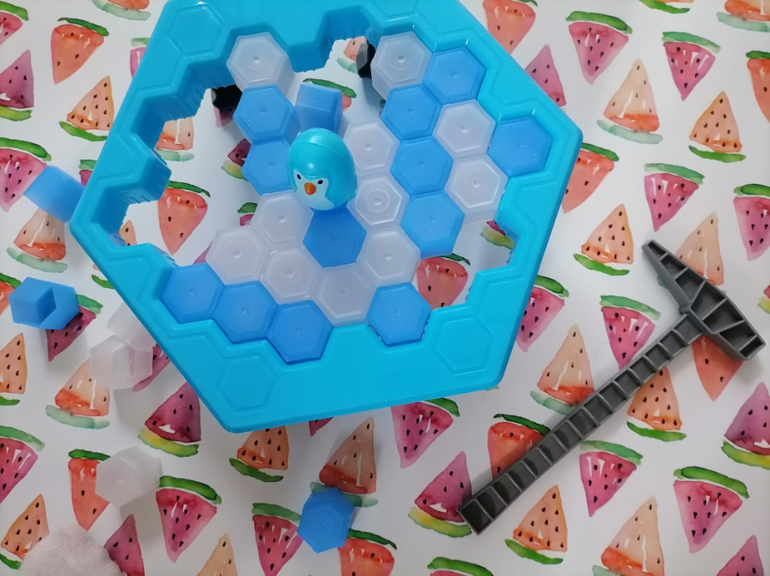 Пингвин в ледяной ловушке - это игра, которую очень любит Лида, и не люблю я. В первую очередь, за то, что подготовка к партии занимает больше времени, чем сама партия. Хотя чем опытней игроки, тем аккуратней (и дольше) нам удаётся выбивать льдинки.