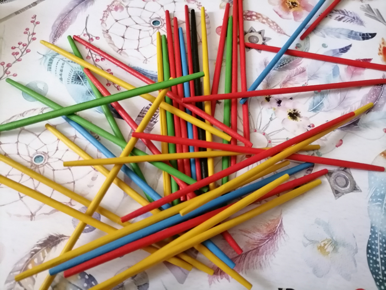 В Микадо играли впервые по правилам, предусмотренным оригиналом. Единая кучка палочек не получилась у нас при резком раскрытии ладони ни с первого, ни с десятого раза, часть разлеталась отдельно, и первый игрок собирал их беспрепятственно. Будем тренироваться.