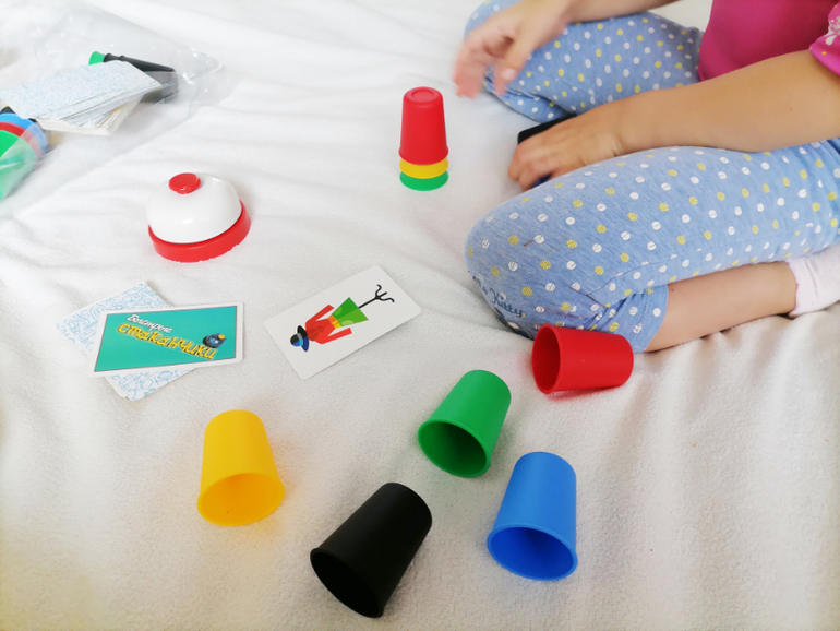 В завершение - не балансир, но игра, подходящая под категорию "Ручной работы" - Быстрые стаканчики (или скоростные колпачки или как из там...) Несмотря на то, что это игра на скорость (а про игры на скорость и дочкину особую "любовь" к ним я писала с месяц тому назад), эта игра Леденца радует. Когда мы играем, я закрываю глаза и считаю до трёх, после этого начинаю собирать стаканчики. Надеюсь, скоро мне надо будет считать до двух, а потом и вовсе перестать поддаваться. А потом начну отказываться от игр на скорость я сама )))