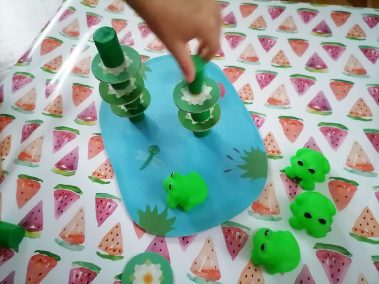Лягушачий балансир, первый балансир малыша, игра, в которую Djeco предлагает играть с двух лет. У нас самодельный, не идеальный по геометрии вариант. И может быть поэтому а не потому, что руки дрожат игра представляет определенную сложность и в 4,5 года. Тем более если использовать приемы, повышающие сложность (кто не знает, башни свая-кувшинка-свая.. ставится на игровое поле в места, обозначенные кружками. И если некоторые из этих кружков занять лягушками, то башни придется делать выше, вплоть до одной башни в 12 этажей - непостижимая для нас задача).