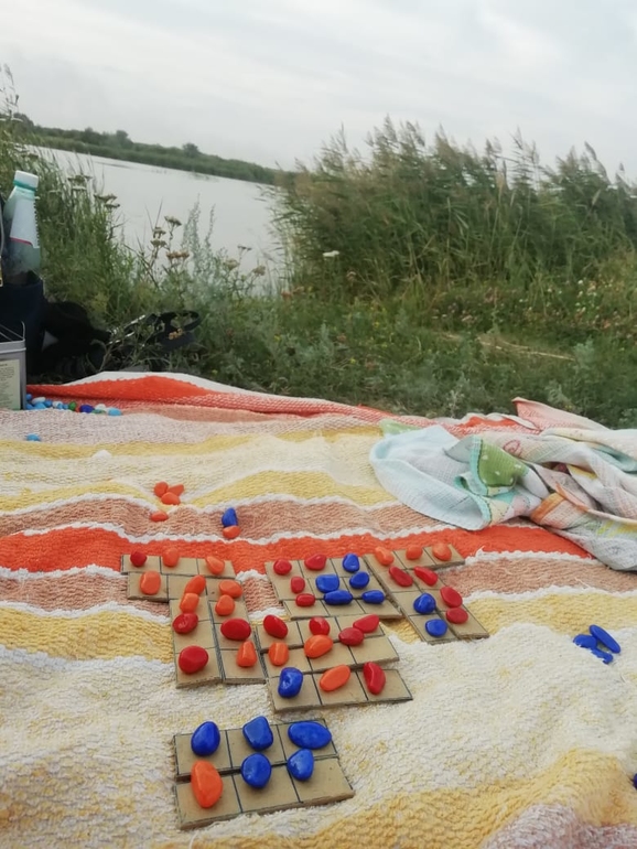 А в следующую поездку я заставила их играть в "Бо", но не продумала, как организовать ровную поверхность. Поэтому играть было неудобно, камешки с плашек постоянно съезжали. Ну и поскольку младший игрок проиграл, то на всех обиделся. Развлекла дочку только игра в перебрасывание старой оплетки руля от автомобиля, которая при броске летала, куда хотела, а не куда бросили.