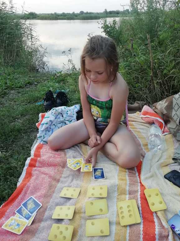 Мой брат ежедневно ездил купаться на нашу реку Тобол подальше от города, в обход всех постов, и мы увязывались за ним. На самой речке находились не более часа, но я и туда хватала какие-нибудь игры, в надежде, что вдруг дочь соизволит поиграть в компании с любимым дядей. В первый день взяла "День сырка" и кубики с распечаткой пнп игры "Хитрый ход" (точнее, последняя игра всегда лежит у меня в рюкзаке - ведь никогда не знаешь, где найдешь подходящую компанию Подойдет компания, а у тебя уж и игра заготовлена! "Вау!" - скажет компания, присядет играть и навсегда полюбит настольные игры. Помечтали? Продолжим.). "День сырка" - ни одного отрицательного отзыва в обзорах, а у нас никак не пошла перед Новым годом, после него, впрочем, тоже.