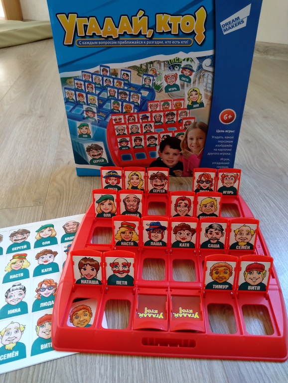 2. Угадай кто? Немного пожалела, что купила игру. Затруднение вызвали у ребенка только первые два раза. Потом щёлкал, как орешки, используя одни и те же вопросы: пол, головной убор, очки. Маловато персонажей, ещё бы пару вариаций игры… хотя сын сказал, что игра интересная. У кого есть подобные игры других производителей, поделитесь впечатлениями...