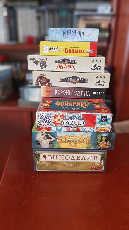 Не обошлось и без новинок. На 1 сентября вручили сыну мои припасы: "Бонанзу" и дополнение к "Стальной Арене" - "Арена". "Бонанза" неожиданно стала хитом. Неожиданно, потому что к ней крайне скептически относился муж, считая, что это своеобразный аукцион, которые он не любит. Но на деле он чуть ли не больше всех в нее втянулся. Она тоже не особо долгая, веселая, простая - еще одна отличная вечерняя игра.