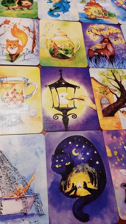 Еще одна новинка - "Мельница. Уютные истории", на которую сын взял деньги из копилки. Очень ему понравились иллюстрации - как он говорит: "Добрые и со смыслом". И я его восторг разделяю - очень красивые, приятные, сказочные. Качество игры тоже отличное - карты плотные и под лен, цвета потрясающе переданы. Это игра - "Имаджинариум" в миниатюре на 20 минут, очень полезна для развития навыка сочинительства. Но играть будем не так часто - она от 3 человек, а муж этот жанр тоже не любит. Играет через "не хочу".