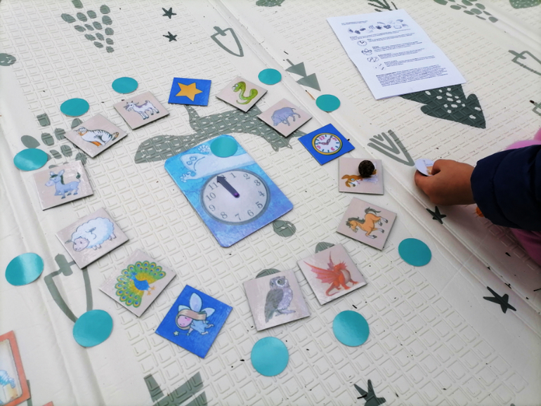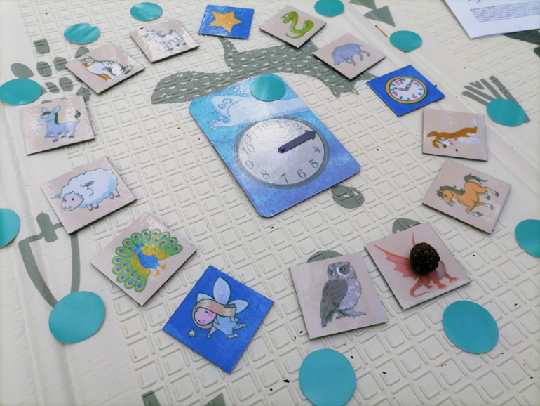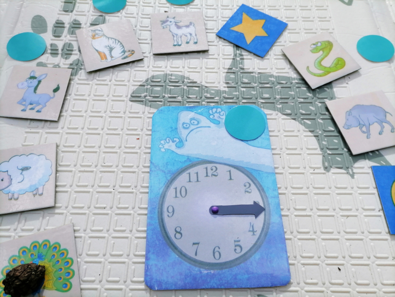 Ситуацию усложняют часы: в распоряжении у нас всего час до полуночи, то есть 12 пятиминутных шагов стрелки. И время буквально утекает у нас из рук: выпала грань кубика с часами - стрелка перемещается вперед на 5 минут. Попал на тайл с часами - снова плюс 5 минут. Неправильно назвал корм - снова 5 минут прошло...