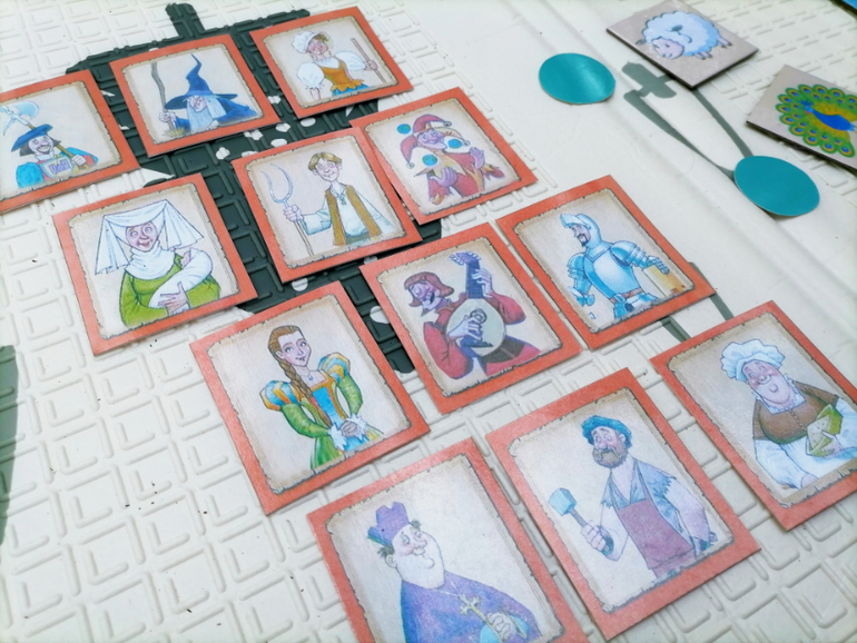 Я почему-то думала, что материалы для печати игры будет легко найти в сети, но когда пришло время делать игру, их не оказалось. Пришлось делать игру самой. Помогла мне Лика, отсканировавшая карты подозреваемых и жетоны корма. К сожалению, в полной версии игры Wer Was'r подозреваемых 10, а в основной версии её дорожной версии людей 12. ПОэтому арлекин и трубадур у меня вышли похуже качеством: их пришлось подрисовывать на основе найденных в сети фотографий. Рисовать пришлось и центральную карту с часами, а остальные изображения (тайлы животных, специальные тайлы, недостающие жетоны корма) я подбирала в интернете.