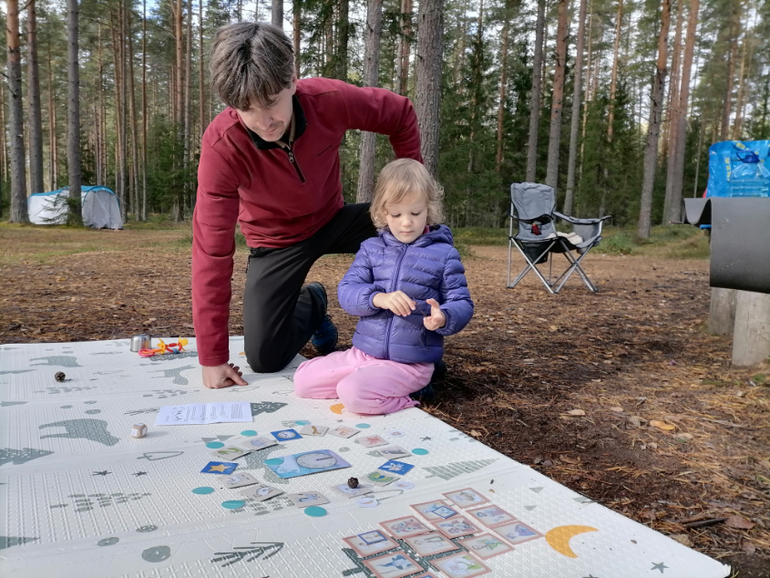 Чтобы вывезти нашу компанию, одной машины мало. Пришлось делать две ходки. И вот во второй половине дня вся семья в сборе, погода пока приятная, хоть по прогнозу обещают дождь в конце дня и всё воскресенье. Отдыхали, жарили мясо на решётке, играли, собирали природный материал, бруснику и чернику, грибочки...
