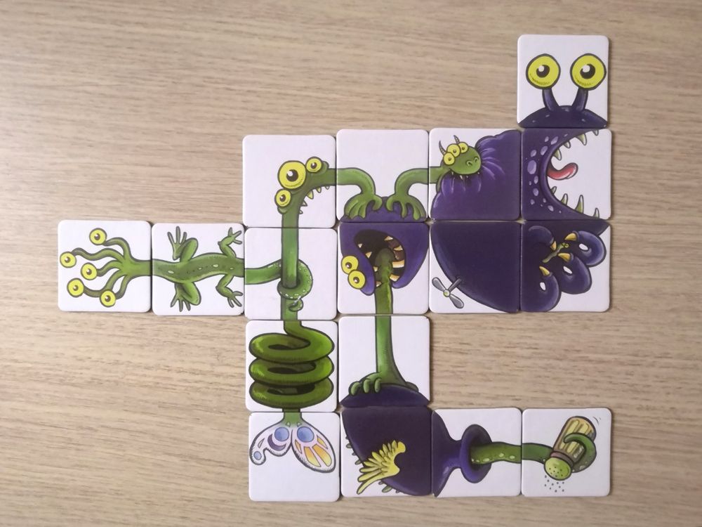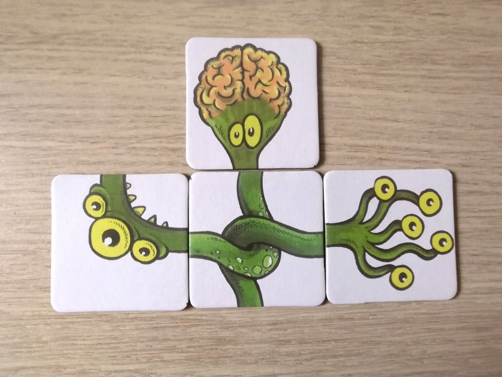 Перемешиваем тайлы рубашкой вверх и тянем по одному стартовому. Далее ходим по очереди. В свой ход игрок открывает один файл с "базара" и пристраивает к своему или чужому монстрику. Когда чудовище будет закончено, сразу переходим к сбору нового. Собирать двух монстров одновременно нельзя.
