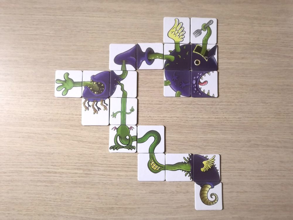 За первого монстра игрок получает столько очков, из скольки тайлов состоит этот монстр. А значит есть смысл сделать своего первого монстра побольше, а соперникам помочь быстрее завершить работу над их первенцами.