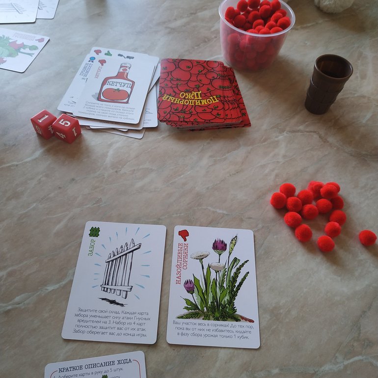 На стадии изучения правил мы сыграли два раза. В первый раз почему то решили, что на стадии сбора урожая надо бросать один кубик и игра подзатянулась. А во второй раз оказалось, что не учли карты вредителей, там помидоры удаляются то со склада, то из корзины,а мы все из корзины удаляли. И мне показалось, что немного затянуто ожидание хода. Может мы опять что неправильно делали.🙈