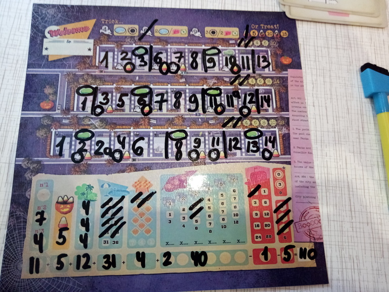Например, набрав 4 конфеты надо сразу решить хочешь ты получить за них 5 победных очков или будешь копить дальше (до 6 конфет). Если решил сразу, то пиши себе 5 очков и дальше копить конфеты тебе уже нет смысла, они больше ничего не принесут. Если решил рисковать и копить дальше, учти, что кто-нибудь более расторопный может тебя опередить и раньше набрать конфет/привидений на желанный бонус. Тогда ты его уже не получишь! Все остальные игроки должны вычеркнуть его у себя.