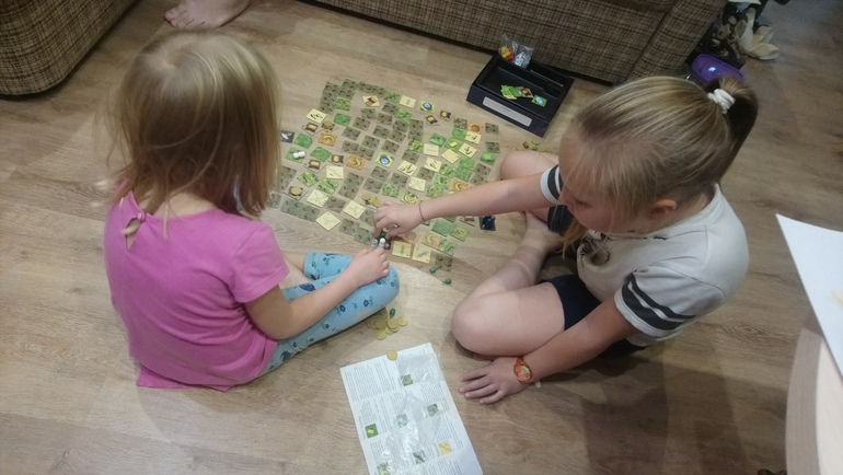 Королевство кроликов. Я пищу от восторга! Мальчики мои более сдержанны в эмоциях. Дане понравилась, а муж так вообще бурчит: "Что за карты вы мне подсовываете?". Дорогой, по кругу ходят одни и те же карты. Это же драфт! Думала, что будет сложно ориентироваться и делать выбор в таком большом количестве карт, но не так все страшно и запутанно. В первой партии мне неимоверно везло. Уже в первом раунде я построила шикарный феод, который с каждым раундом расширяла и возделывала. Мои мальчики "въехали" в игру ближе к середине, поэтому итог предсказуем: я - 201, сын - 168, муж 133 ПО. Во второй партии уже начались соседские междоусобицы, посыпались палки в колеса повозок с морковкой, до гражданской войны не дошло, но королевство процветающим не назовешь. Итог партии скромен: муж - 147, я - 134, сын - 95 ПО. Однозначно игру буду покупать в коллекцию. Играем сейчас не в наш экземпляр.