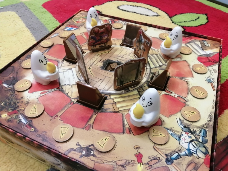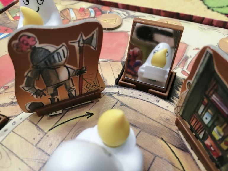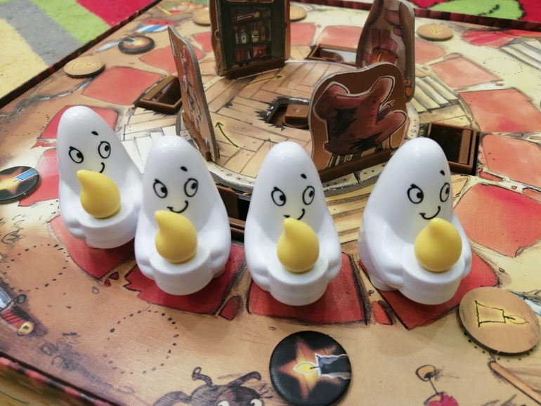 Подготовка к игре очень быстрая, нужно положить поле, поднять зеркала, поставить фигурки привидений и разместить на поле фишки