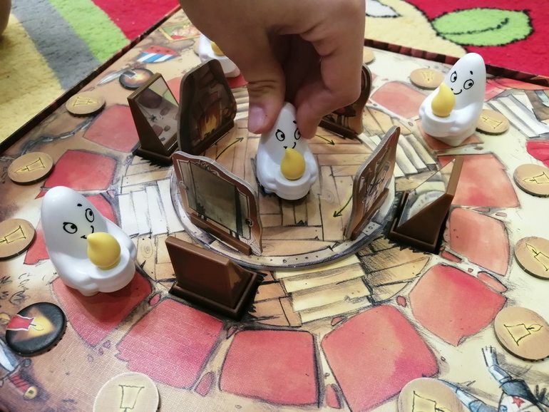 Если на кубике выпал Зеркальный призрак, ты должен пройти испытание или сделать ход-джокер. Чтобы пройти испытание нужно поставить любую фигурку призрака в центр вращающегося круга и медленно поворачивать его по стрелке, пока призрак не станет напротив одного из зеркал.