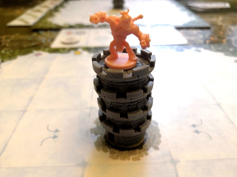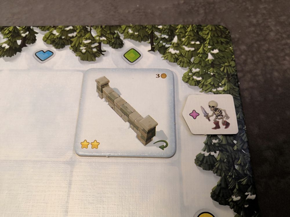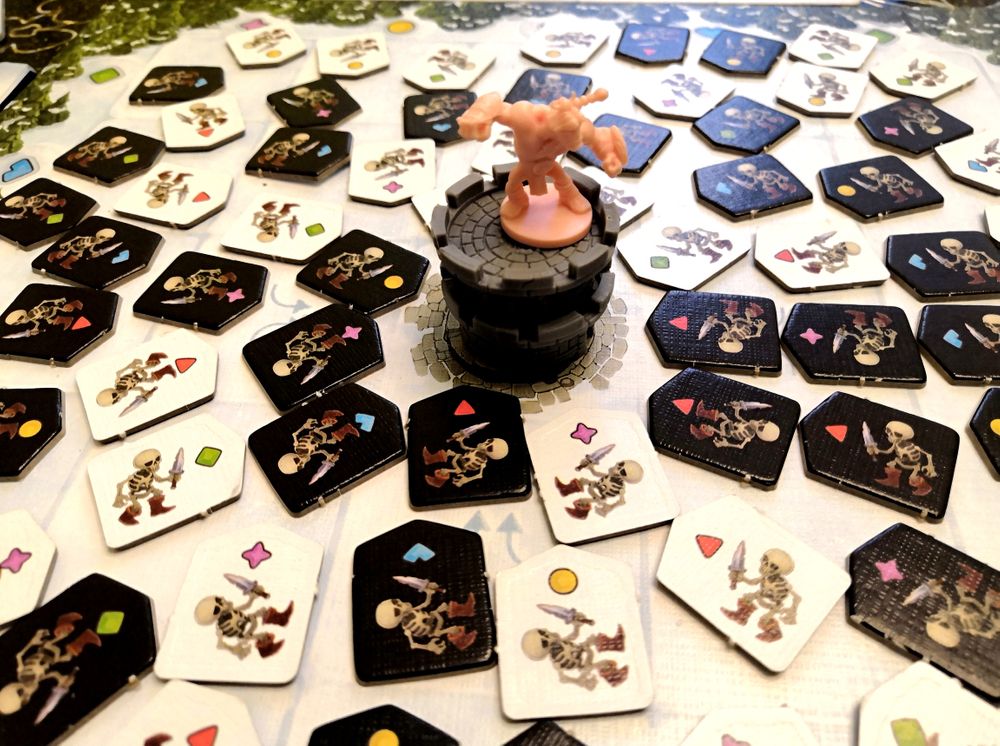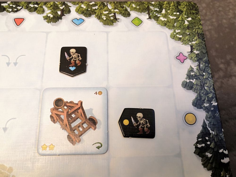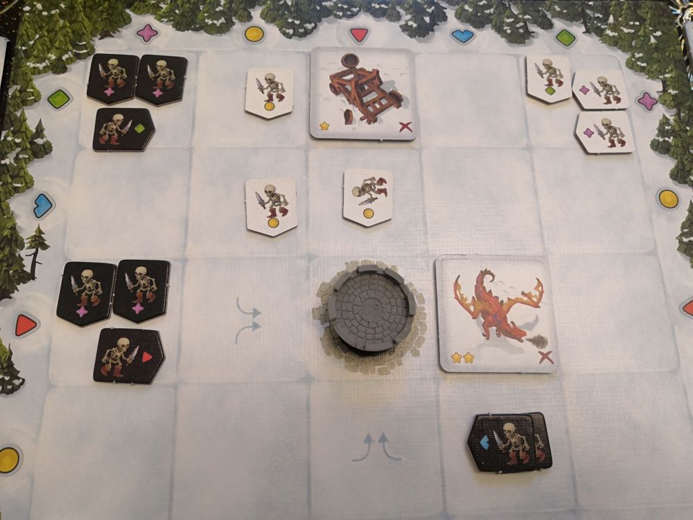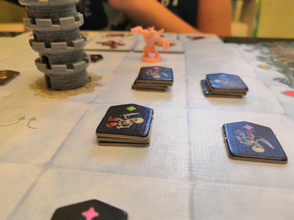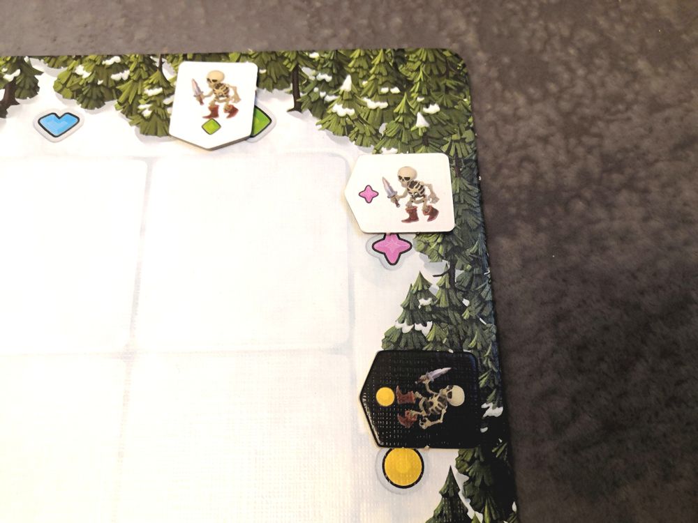 Чтобы не запутаться, какие скелеты сделали свой ход, а какие еще нет, у жетонов двусторонняя сторона. Сделали ход жетоном, перевернули его. На фото видно, что часть скелетов сделала свой ход, а часть нет. Если переворачиваем с белого на черный (это отмечено маркером на счетчике раундов, запутаться сложно), значит в нашем примере белые еще не сделали свой ход. Запечатлела, как раз взятие башни. Сейчас один из белых скелетов сделает свой ход по направлению к башне и разрушит один ее ярус((