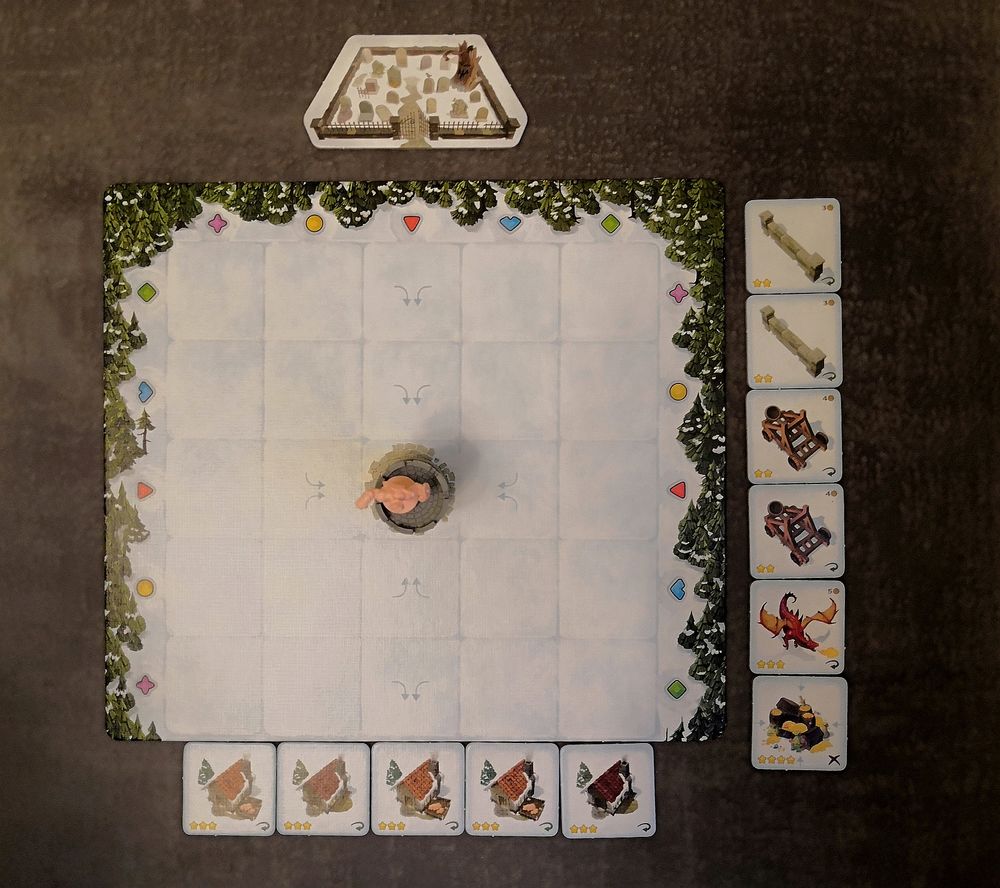Стартовый набор игрока - это поле 5х5, пять домов, составляющих деревню, многоярусная башня и герой в ней, кладбище и шесть ловушек.