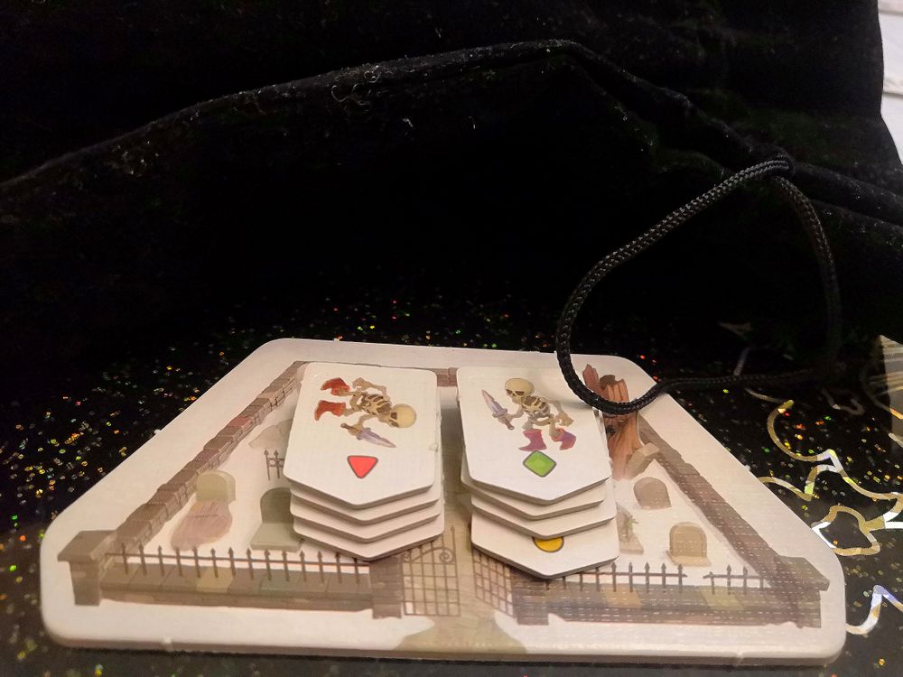 Ходящих мертвецов аж 180 штук! Никак чингисханова армия встала из могил) Помещаем их в темный мешочек-преисподнюю и тянем в начале игры по 4 штуки на игрока. Скелеты начинают свое нашествие с краев поля. По значкам и направлению жетона можно определить, где нужно разместить врага. На фото специально разместила черный жетон неверно. Этот скелет начнет атаковать сверху поля.