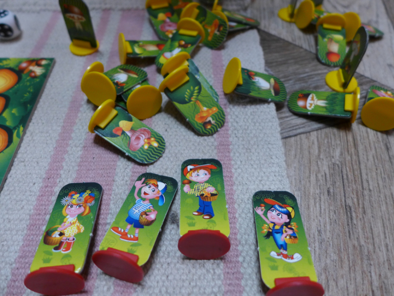 Ну и интересно завершение игры. Когда один из игроков срезает (или правильнее вырывать ножку с корешком-грибницей?) последний гриб, все устремляются обратно к домику. И тут важно понимать, что нужно стараться не уходить вглубь леса ближе к концу игры. Кидаем кубик, удваиваем очки, платим один гриб лесу (сбрасываем куда-нибудь в сторону или в коробку, гриб уже не участвует в подсчёте) и топаем в сторону дома. Хорошо, если вам выпадает 5 и 6, можно не сильно тратясь, быстро дойти до дома. А мне шли только 1 и 2! Я заплатила волшебному лесу за возвращение половину свой добычи((( В общем, дочь выиграла, как обычно в последнее время.