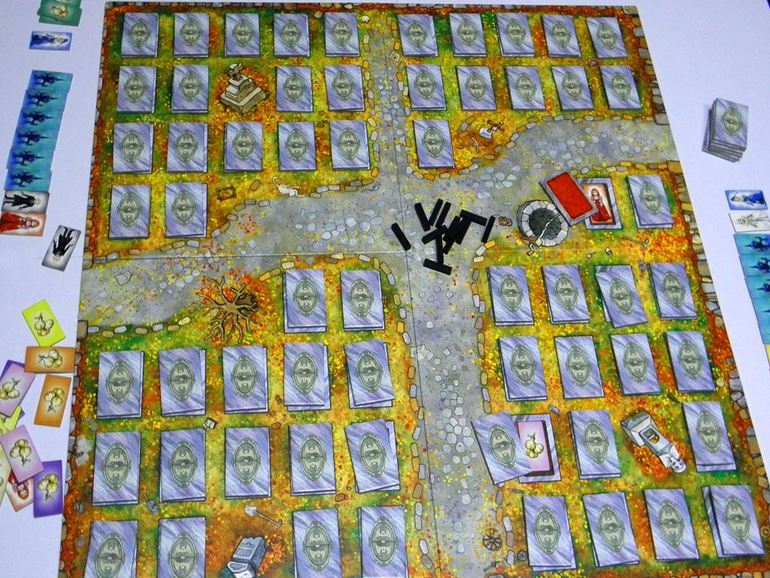 Есть замок с 3 комнатами, в каждой из них надо собрать по артефакту и выйти из замка. У каждого артефакта еще своя стоимость. Выиграет тот, кто наберет больше очков. Есть Король-призрак, который гоняется за остальными и отбирает эти артефакты)) Если остановился на желтой клеточке поля, берешь карту из стопки Карты чудес (сделай еще 5 шагов, шагни навстречу Королю и т п). Покупалась давным-давно для старшего еще, стоила "3 коп"))