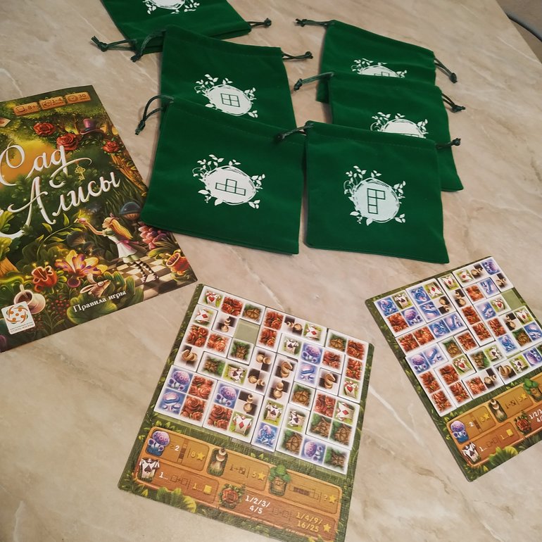 Сад Алисы куплен 2 недели назад, как же он мне нравится! Меня как раз манит эстетика Льюиса Кэрролла, ну и тетрис я люблю)) Есть и Пэчворк, и Листопад, но Сад Алисы совершенно особняком от них стоит и по-своему воспринимается. Сын 5,5 лет меня периодически обыгрывает, правда, норовит подсмотреть, когда тянет тайлы, но в любом случае ведь нужно грамотно их расположить.