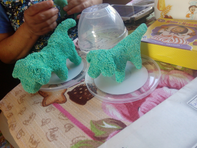 Потом они его смешали, был жёлтый и голубой. Мешали долго, то так, то эдак. Потом из зелёного пластилина я лепила то, что меня просили. Помню собачек, пирожки, корону...