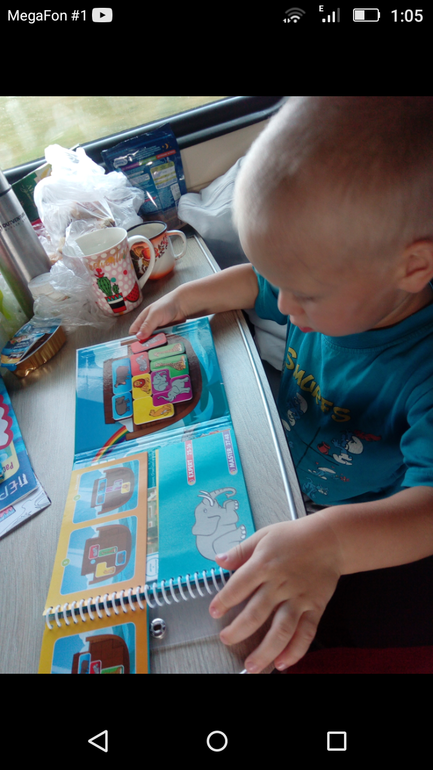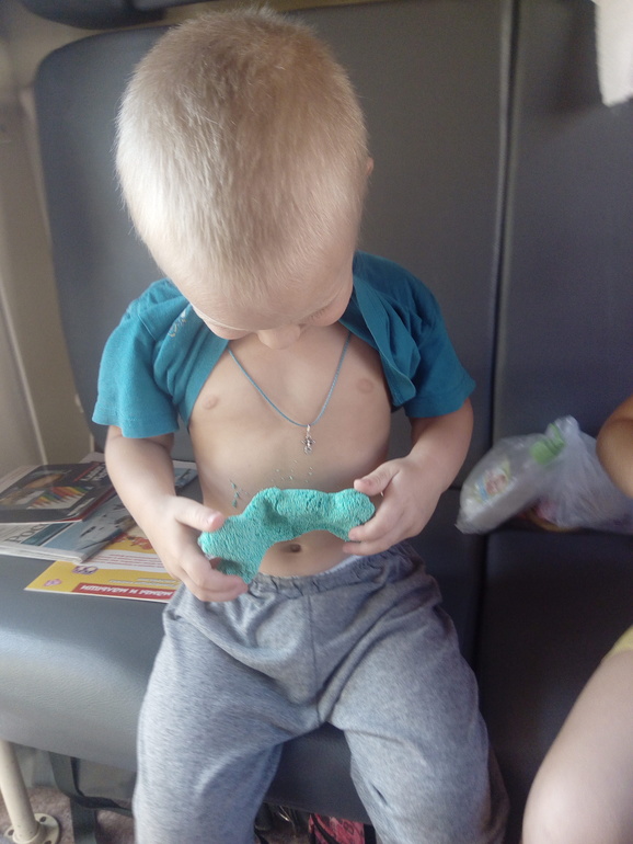 А обратная дорога была в купе. И дети были в коридоре, с кучей других детей. Они носились, везде лазили и их было много. Но я достала Шариковый пластилин! Мне хватило 2 баночки из фикспрайса на вагон. Дети его мяли, рвали, склеивали, приклеивали к стенам, к окнам, к дверям, к себе... Следов не оставляет!