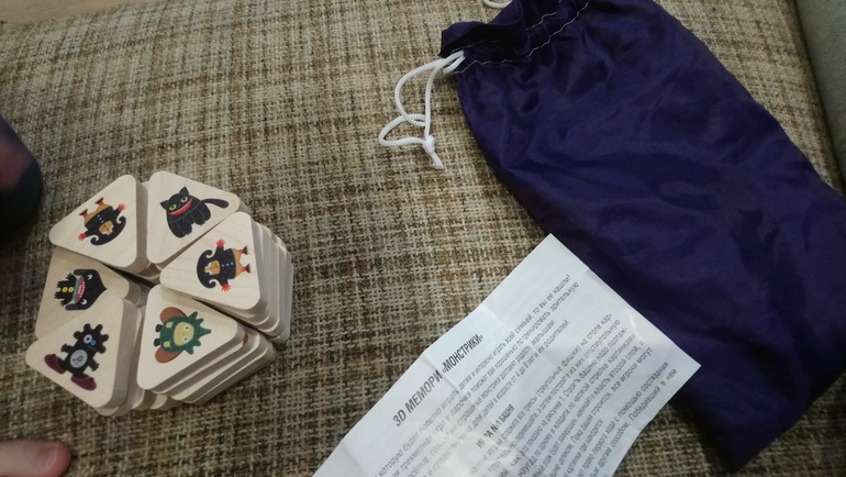 В мешке треугольное мемо монстрики. Мы играем по правилам, когда строится пирамида и постепенно она разбирается. Всего 36 деталей, поэтому разбираем пирамиду быстро, как орехи)