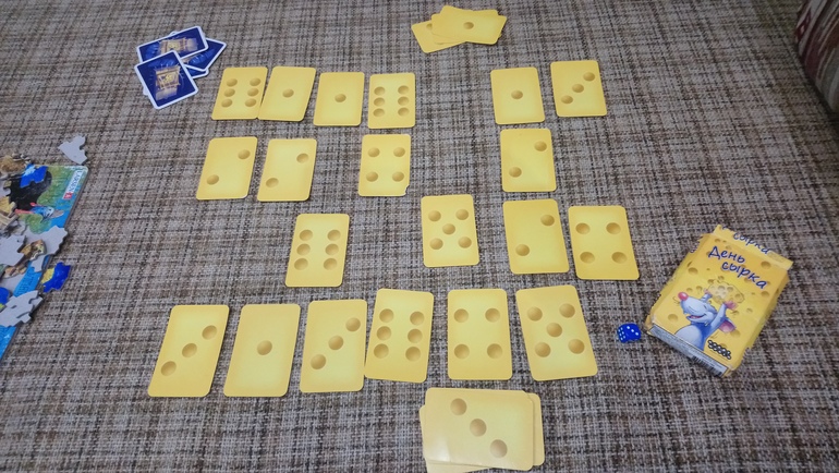 День сырка. Ребёнок выдумал свои правила, мы раскладываем все карточки, потом бросаем кубик и можно открыть любую карточку со значением. Если мышеловка, то карта сбрасывается, если мышь, то берём себе. В конце игры подстчиваем дырки