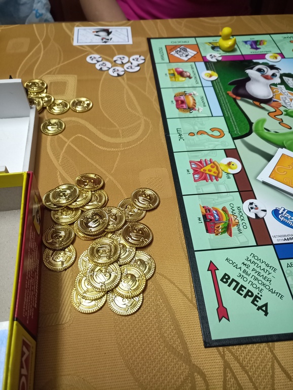 Вот это, блин, конечно эпично было! В процессе первого круга игры пришло откровение, что Средний, которого мы вежливо отшили и который , обидевшись, ушел в другую комнату строить поезда, вполне мог с нами в нее сыграть, а для Старшей, так это вообще мягко говоря, поздновато. А я ее доставать не хотел, думал, рано. Деньги с игры однозначно - в топку! Недоразумение, за которое стыдно даже китайцам. Эта фраза, пожалуй, будет не раз еще повторяться. Не буду далеко убирать ее.Монетки с Али (алиэкспресовский, сокр.) гораздо лучше подошли.