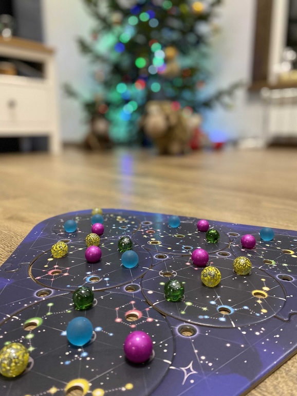 3. Стеллиум. Эту игру я купила для себя, хоть и подарила сыну)) Она такая красивая и атмосферная, немножко может занудная и на подумать, но нам нравится. Сын может и не будет ее доставать первой, но не откажется поиграть. Конечно, больше подойдет деткам постарше, но и сейчас сын вполне справляется, берет не сложные схемы и не забивает себе голову многоходовочками как папа), что часто приносит сыну победы. Мне безумно нравятся шарики, как удобно все складывается в коробочке.