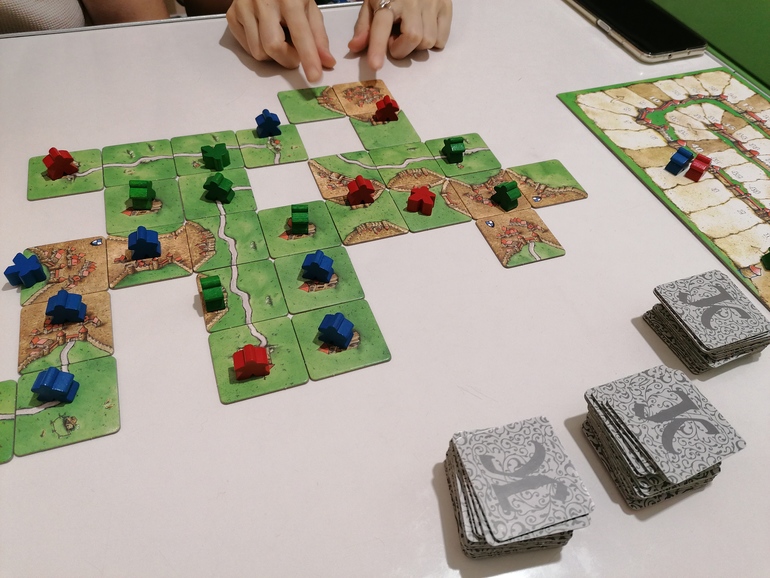 Невольно глаз зацепился (не люблю указывать на ошибки, но может это случайно получилось , для фото) - этого мипла сюда нельзя ставить (один синий уже есть в городе и объединения ранее выложенных тайлов здесь тоже нет). Если предполагается соперничество за город с зелёными, то добавлять своих миплов надо иначе, нельзя своих просто добавлять в уже занятый своими же.