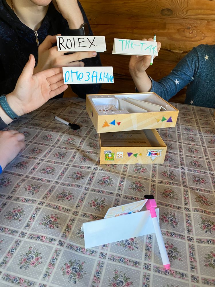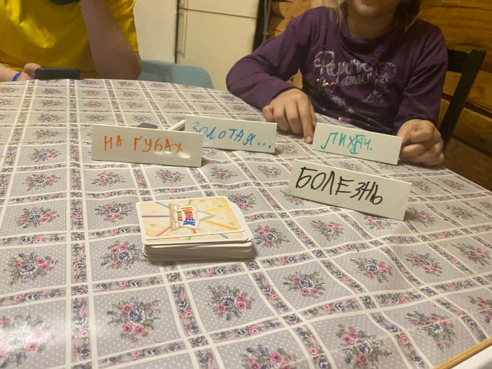 Правила предельно просты. Активный игрок выбирает карточку и называет цифру от 1 до 5. Другие участники видят слово и должны подсказать с помощью надписи активному игроку. Если подсказки повторяются, они стираются и не участвуют в игре. Иногда угадать слово нужно по одной подсказке. Некоторые слова не известны детям - меняем задание, а слово популярно объясняем.