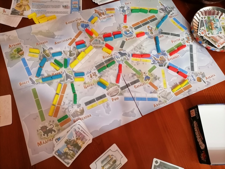 Билет на поезд Джуниор. 1 партия. Детскую версию я делала специально для дочки, у нас только Европа, у неё и брали вагончики. Оказалось, игра была предложена рановато : дочке сложно держать в голове маршруты, и планировать прохождения перегонов для них. Я подсказывала, но дочка всё равно "теряла нить" и сдулась на полпути, сказав, что ей скучно. Доиграли взрослым составом, отложим на полгода.
