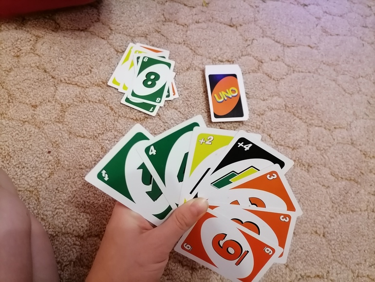 Уно - 3-4 партии. Да, да, новинка, не смейтесь))) Игра детства была подарена нам на новый год , и потому мы оживили воспоминания, поиграв и так и сяк, с дочкой и без неё.