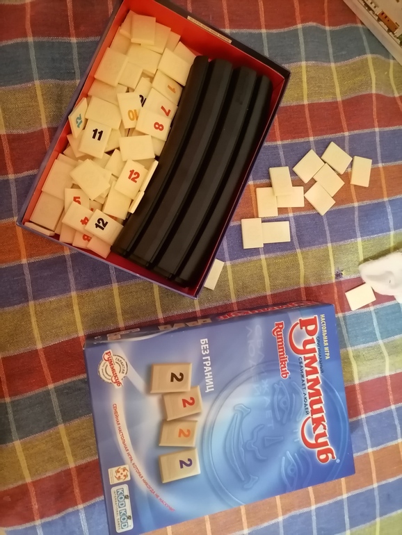 Руммикуб, 3 партии разным составом. Для нас это спокойная семейная игра, в которую можно играть даже за чаем с пирожными, что является отдельным плюсом. Как и любимый давно Скрэбл, но в него мы в этот раз не играли.