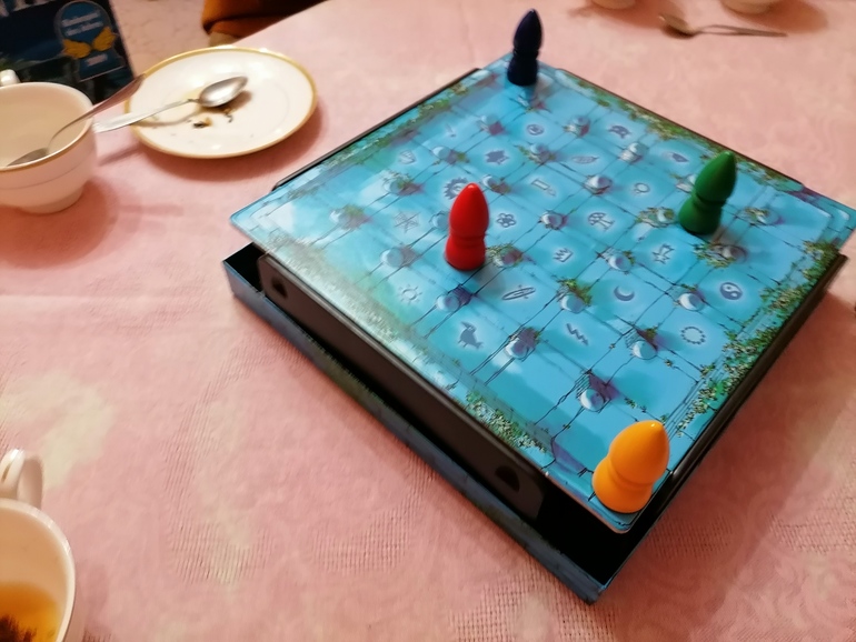 Магический лабиринт, 3 партии. А эта игра неожиданно "выстрелила" у взрослой компании. Играли азартно, весело, увлечённо. Шумно радовались тому, когда новые "сокровища" неожиданно открывались в одном шаге от тебя. И обречённо выставляли фигурку в сотый раз из угла, потому что запомнить все стены нам не представлялось возможным))
