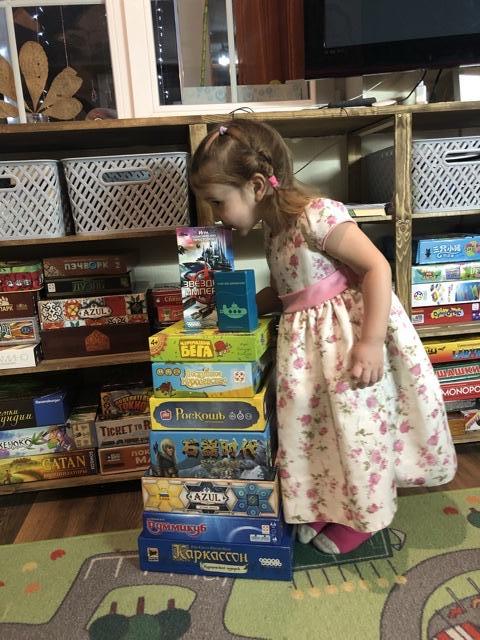 🤣 вчера чтобы доиграть в каменный век, дала ей на растерзание 2 мешочка из Азулов, паровозики из Билета на поезд и кубики из Саграды. Все смешала и варила суп😁