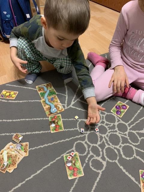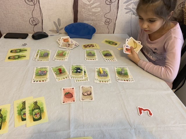 Дочка любит эту несложную игру на блеф с элементами push your luck. Она довольно азартна, хотя с большим количеством игроком было бы ещё интереснее. Выиграл папа, опередив нас с дочкой на 2-3 очка.