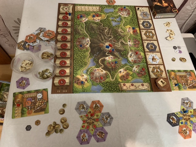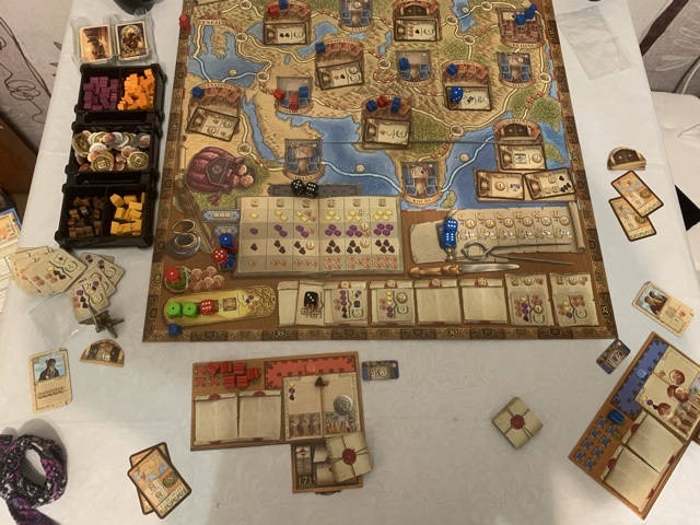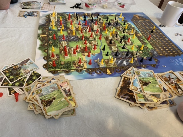 Это был выстрел в сердце! Какая же она классная оказалась. Не знаю как на двоих, но втроём мы играли в неё очень напряжённо. При этом был такой радостный подъем и ожидание каждого хода, что не самые простые расчёты в конце каждого раунда совсем не портили впечатления от процесса. Дочка играла очень неплохо и хотя с созданием единого феода у неё получилось чуть хуже, зато со свитками она управилась гораздо лучше меня.