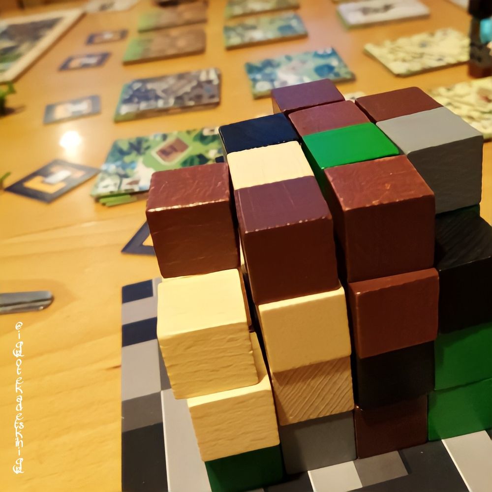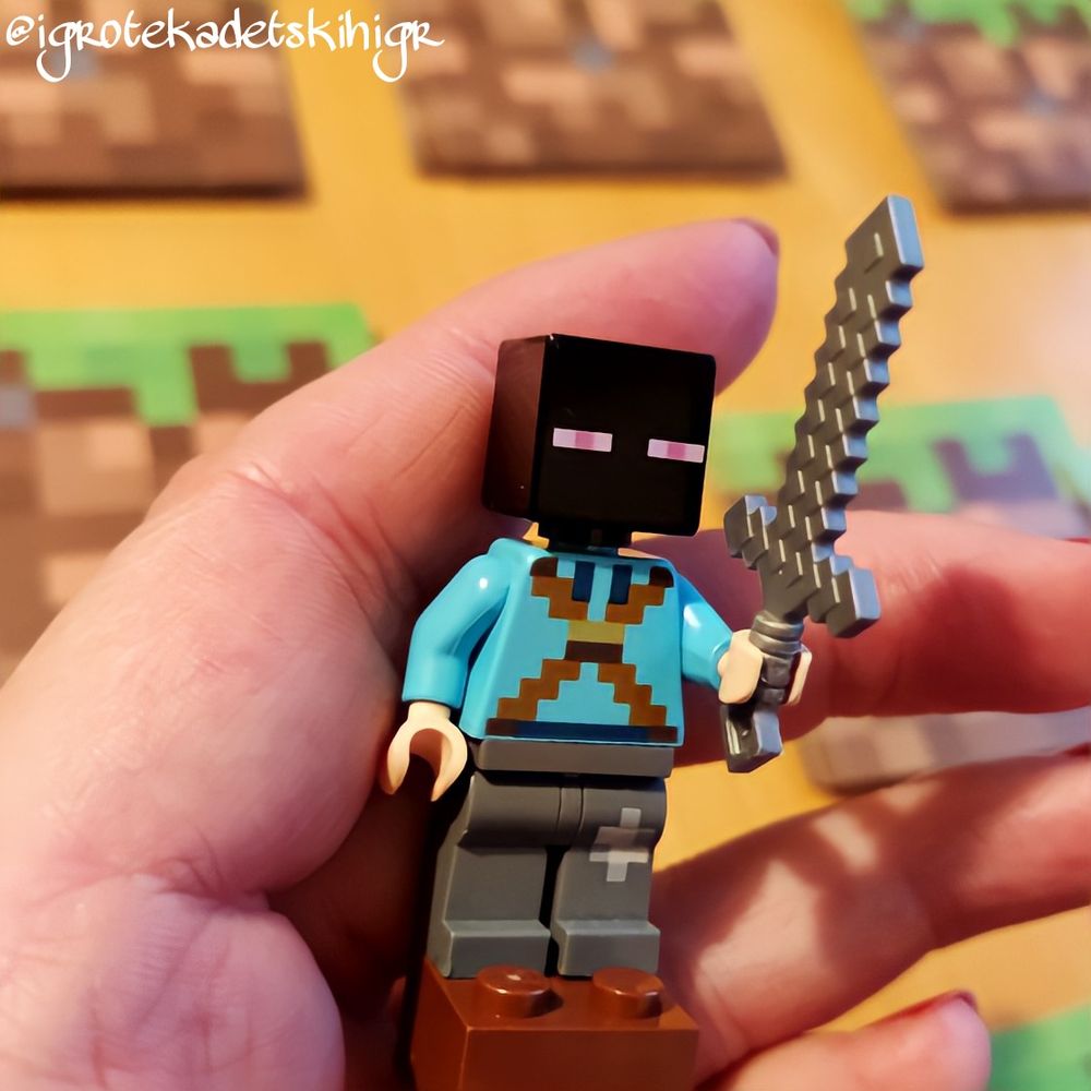 Игра, в которой дети разочаровались. Картонных героев ещё в прошлый раз мы заменили на Лего человечков. Но и это не спасло игру в целом. По словам Ярослава она скучная, ему совсем не нравится сражаться с мобами на карточках и заполнять области на своем планшете. Ребенок ещё обратил внимание, что обласи совершенно одинаковые, только постройки на них различаются. Поэтому для Ваших любителей Майнкрафта, советую обязательно посмотреть перед покупкой видеообзор.