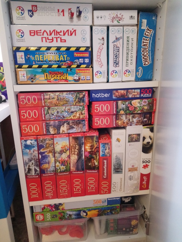 Головоломки тоже люблю, на новый год купила пять новых и ещё три новогодние с фломастером. Полностью так и не прошли ещё не одну, но у нас пока временное зимнее увеличение тренировок, и минимальное проведённое время дома Самое сложное было потом уложить их в шкаф, так как люблю, чтобы была логика, то с лёгкой руки, выкинула все коробки, переложила их в мешки. В мешках лежит цветовой код, супер офис. Ящик в зоне доступа детей, берут что хотят и когда , решают не системно, но часто. Три игры в ящике, лежат временно.