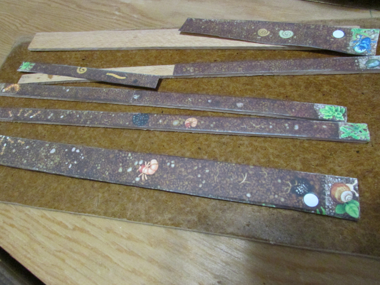 Карточки червячков мы решили сделать деревянными. Муж напилил мне плашечек, на каждую плашку я приклеивала распечатанное изображение и тоже обклеивала аккуратно скотчем. Они очень легко идут по игровому полю, нигде не застревая и не останавливаясь.